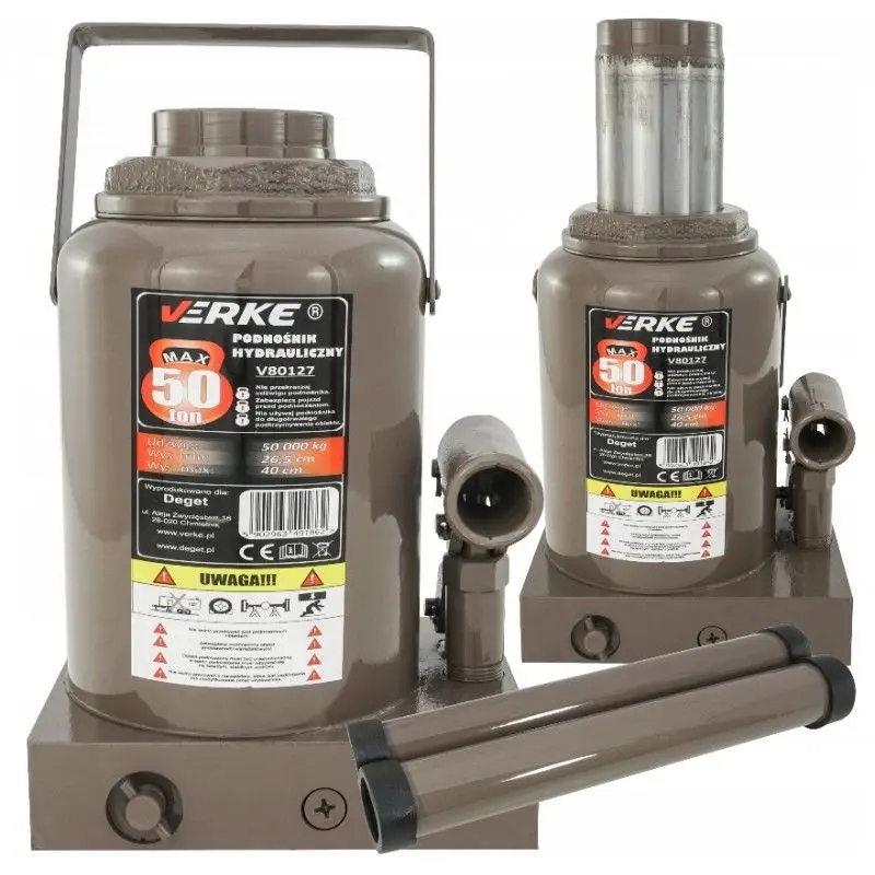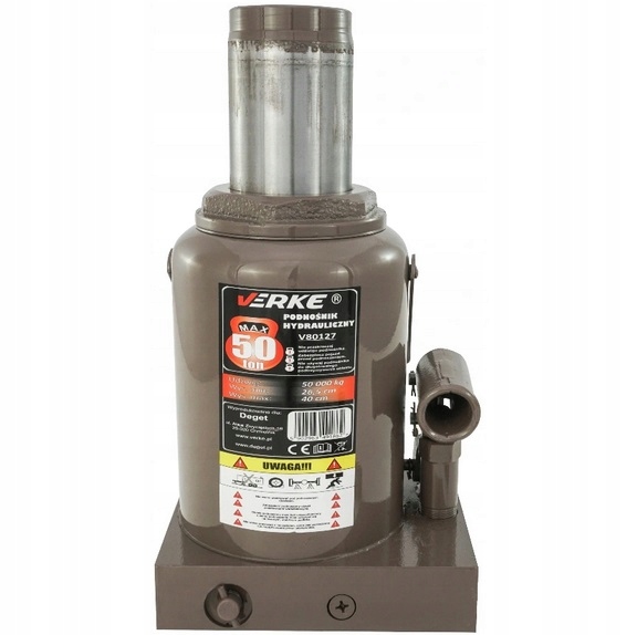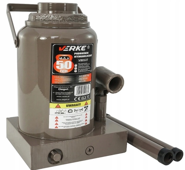 Wysokiej jakości podnośnik hydrauliczny marki VERKE o maksymalnym ciężarze podnoszenia 50 tony.