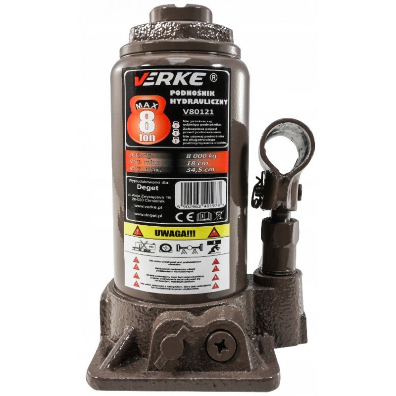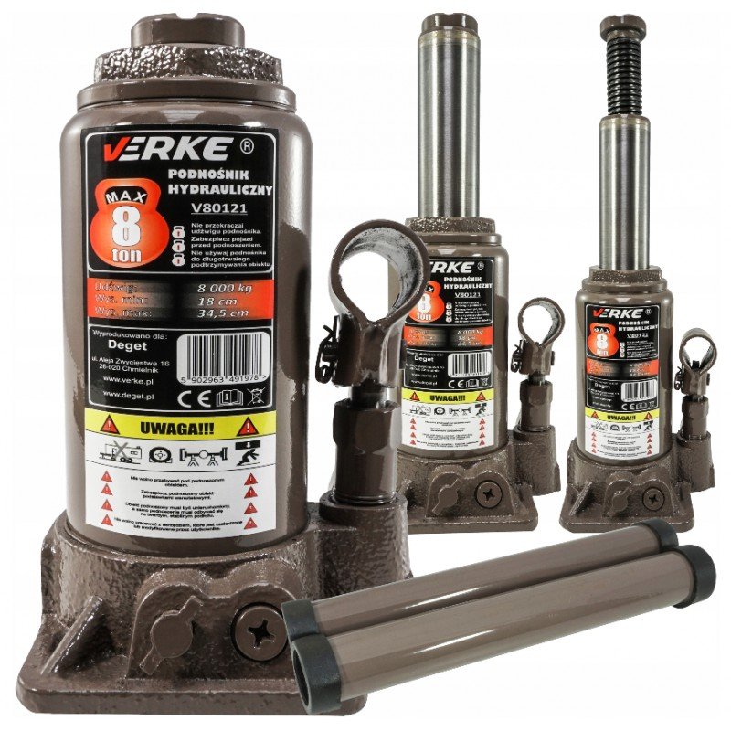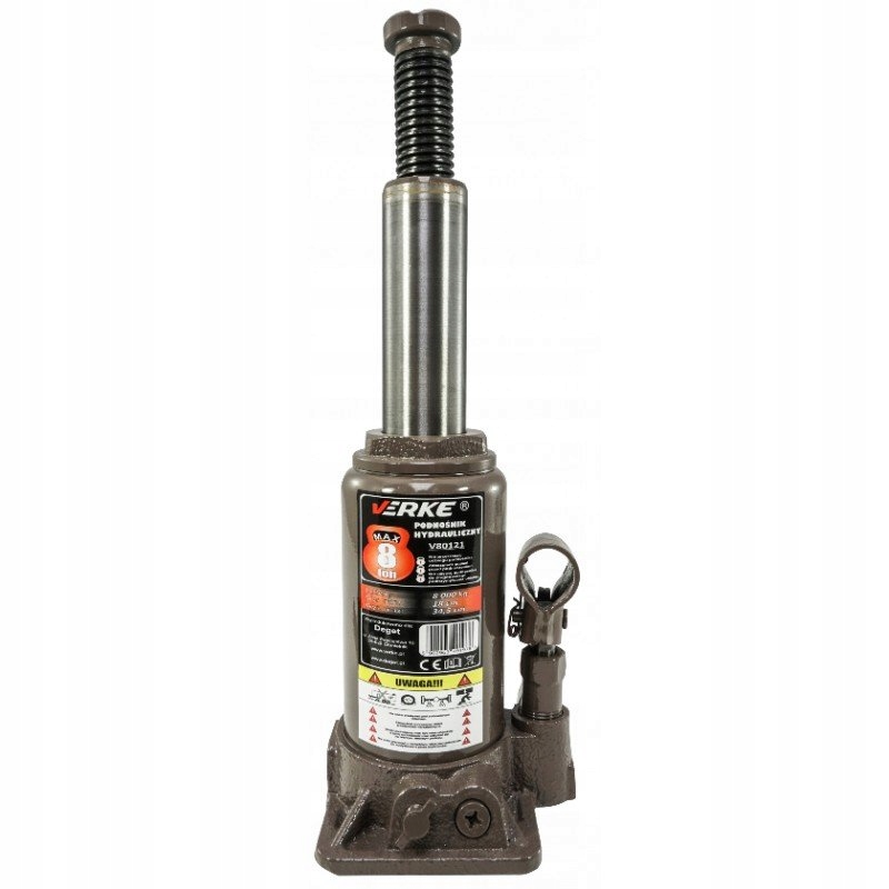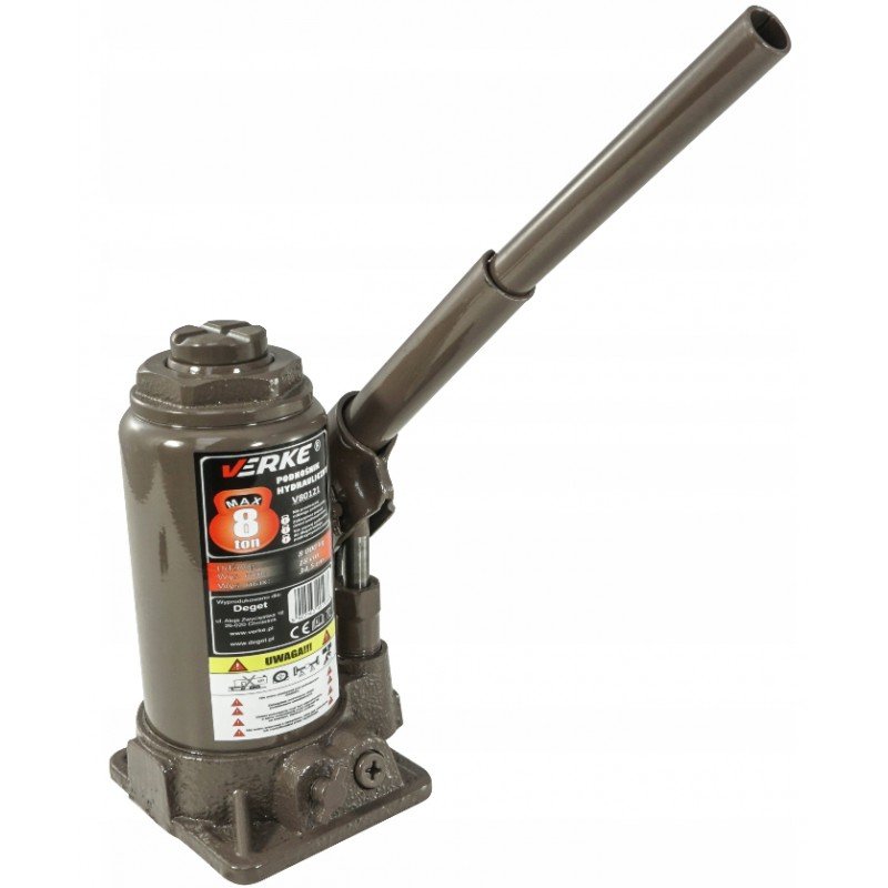 Wysokiej jakości podnośnik hydrauliczny marki VERKE o maksymalnym ciężarze podnoszenia 8 tony.
