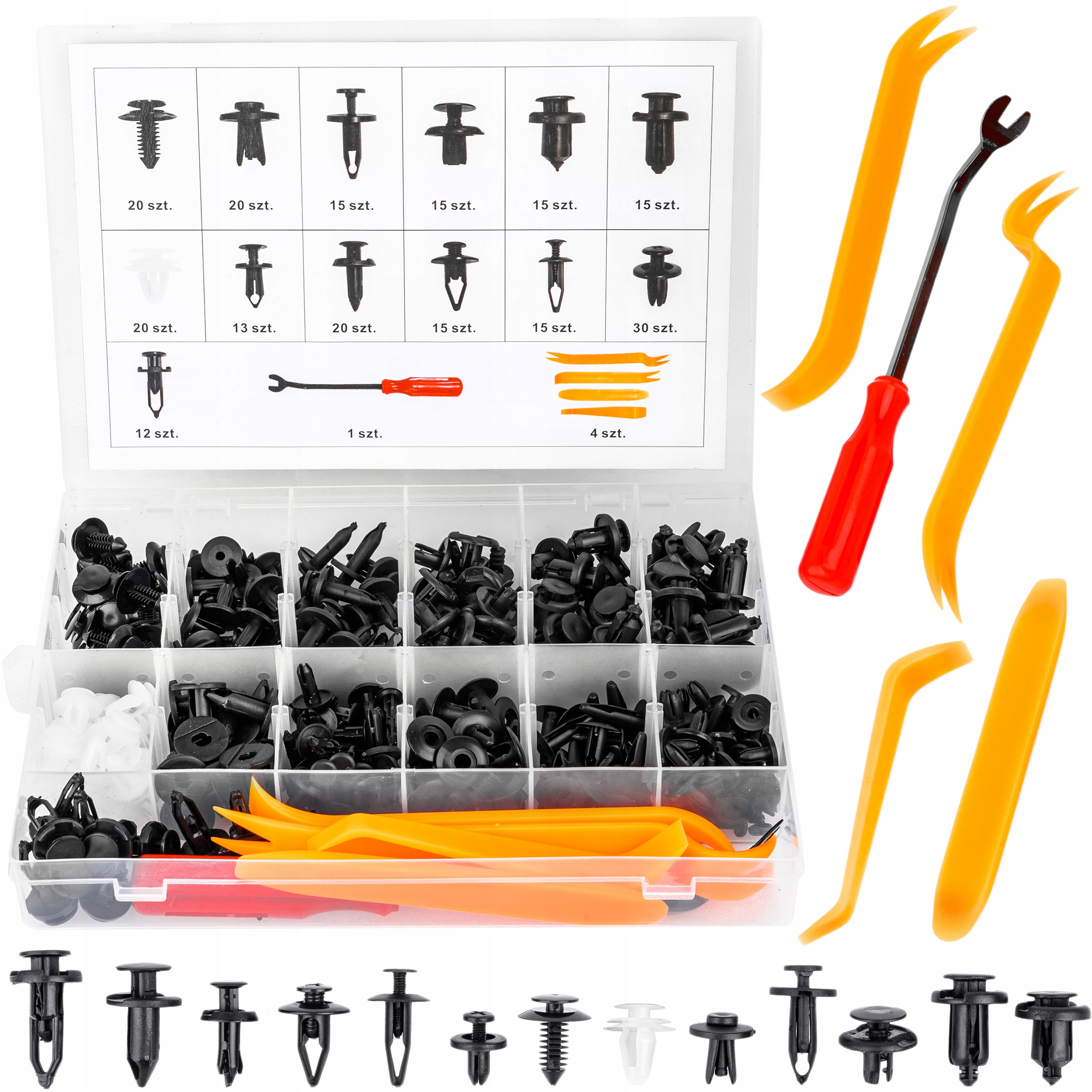 Zestaw 230 elementów w skład którego wchodzi 13 najpopularniejszych rozmiarów to uniwersalne rozwiązanie, które pasuje do wielu modeli samochodów, oferując różnorodność rozmiarów i typów elementów montażowych.