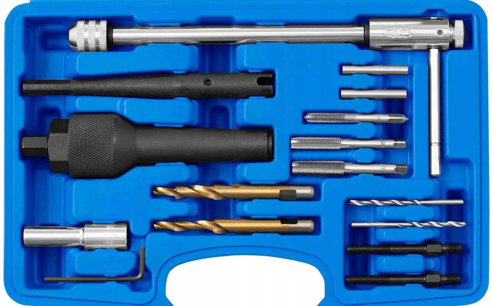 - Uniwersalność – 16-częściowy zestaw do świec żarowych i gwintów różnych producentów i modeli pojazdów (M8 x 1,0 mm, M10 x 1,0 mm i gwint świec żarowych 1/4 ” – 28 UNF)
